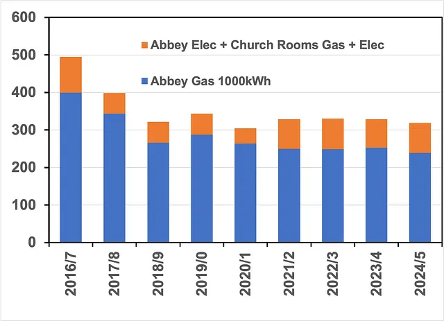 The dominant part is for gas for heating the Abbey. For comparison, an average three-bedroomed house uses 15,000kWh per year.